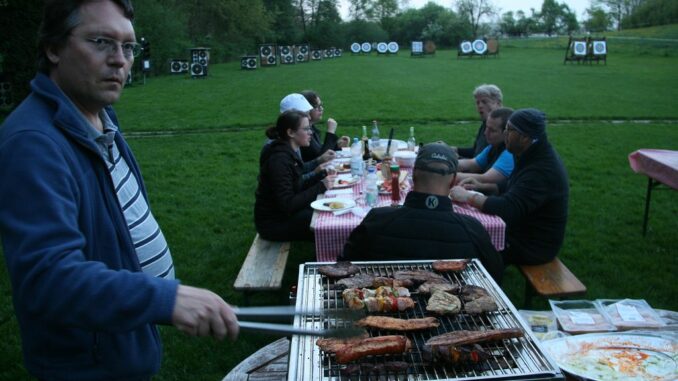 Auch die letzte Scheibe ließ die Schützen die Pfeile durch das Vordach schießen. Es war klasse und wieder interessant was unser kleines Gelände doch alles hergibt. Zur Abrundung der Meisterschaft wurde der Grill angeheizt um die Köstlichkeiten von Marios Metzger zu braten. Währenddessen wurden von den Teilnehmern der Parcours wieder abgeräumt und die Scheiben im Bauwagen verstaut. Das gemütliche Essen und die gute Stimmung lies es schon Dunkel werden, bis Brigitte und Joe die Siegerehrung vornahmen. Als Preis gab es in diesem Jahr Goldhasen und Weizenglasfliegenschutzabdeckungsvorrichtungen von der Stadt.